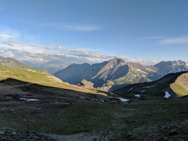 We made it to the top, but before we even took the views in we heard someone shout Michael's name. I was baffled as we were obviously on top of a mountain in The Alps - who would recognise us up here?! It happened to be the two lovely lads we had met back at Birmingham airport, Joe and Stu. They were hiking the TMB in 9 days, without a rest day, so we expected them to be absolutely miles ahead of us but we found out they'd had a lie in on this day and it was lovely that our paths happened to cross. I flopped down next to them and we spent around half an hour catching up about our first days before taking in the view and heading off as a group. The views continued to be beautiful. We had an up and down path before us, crossing smaller patches of snow, climbing over rocks and following slightly unclear routes but it didn't take long at all for our refuge to come into view. We leisurely strolled down to Croix du Bonhomme where we'd be spending the night and said our goodbye's to Joe and Stu who had a few more miles to go before reaching their camping spot.